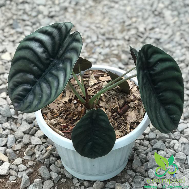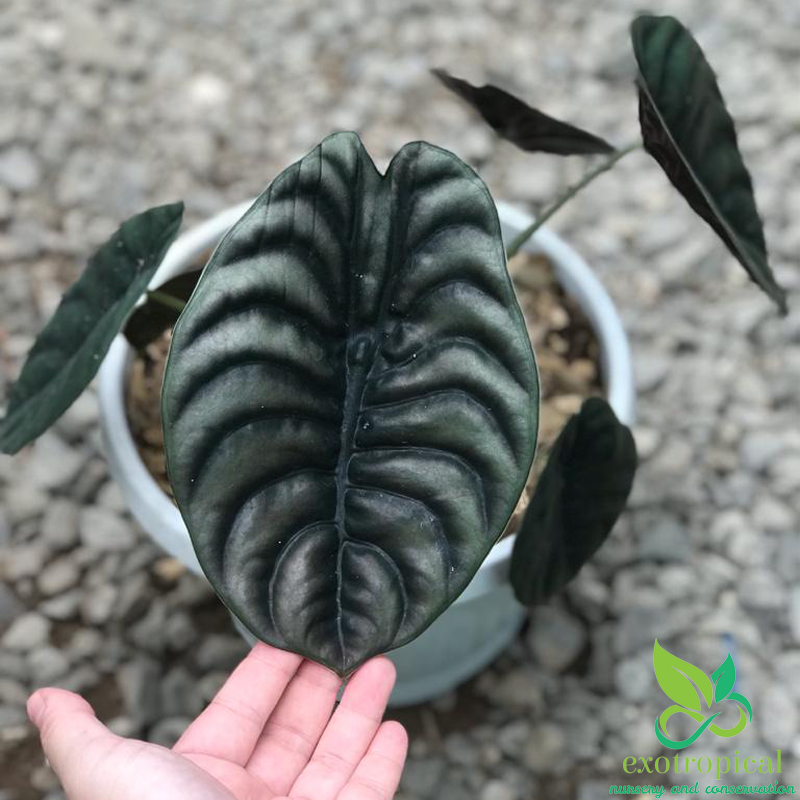 Known as “Elephant’s Ears” or “Mirror Plant” because of the leaves shaped and look like one. A species of plant in the genus Alocasia native to Borneo, Indonesia. Their leaves can grow up to about 24 inches long. The color of the foliage is a mix of copper and deep green with a silvery sheen veined on it.