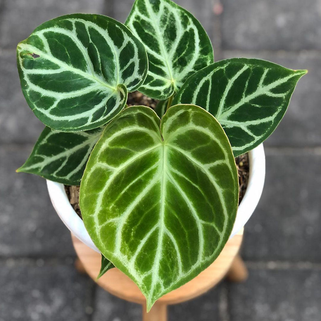 Anthurium Dorayaki have silver green veins on their dark green leaves with velvety texture on their leaves.