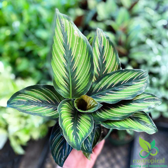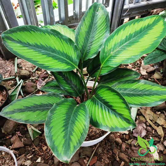Calathea Beauty Star or most known as Prayer plant, Peacock plant or Zebra plant is native to Brazil. They have long, fairly narrow dark green leaves flamboyantly stripped in paler green, silver, and white. The underside is rich purple.