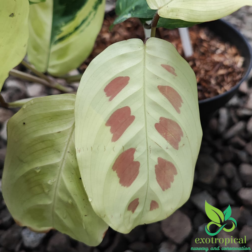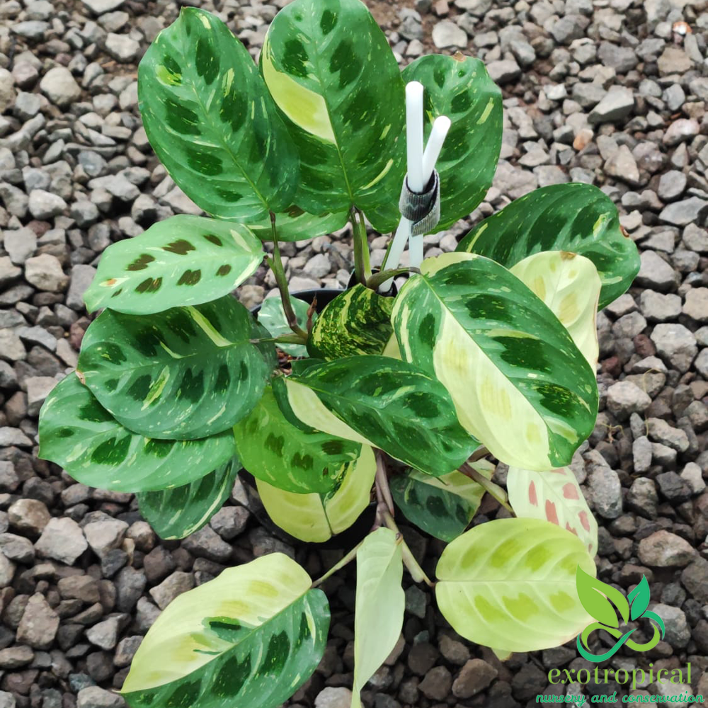 This beautiful plant has green leaves with brown spots on it and yellow variegation for the variegated ones.