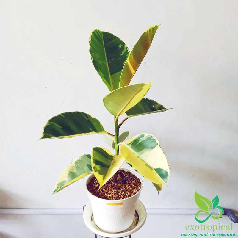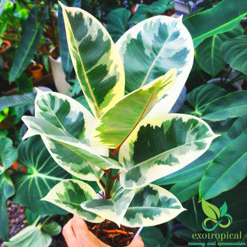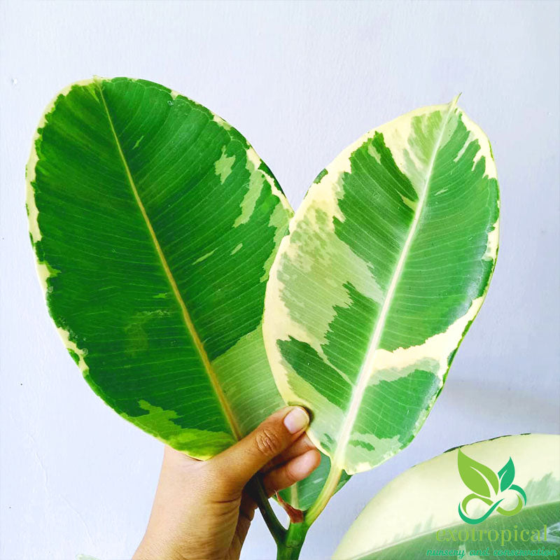 This plant is native to eastern parts of South Asia and Southeast Asia, also known as Karet Kebo Variegata in Indonesia. The variegation of ivory and shades of green on their large rubber tree leaves makes them a unique and beautiful plant.