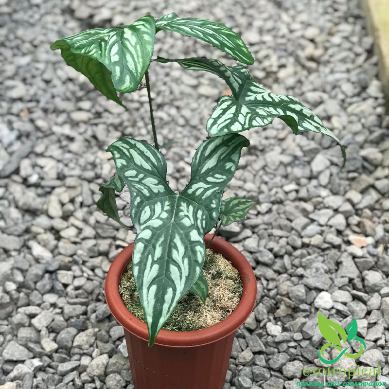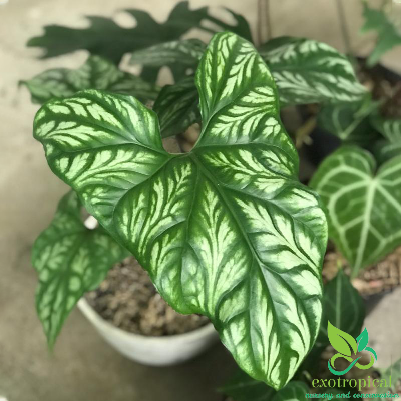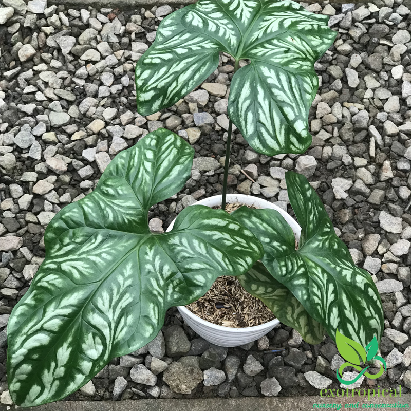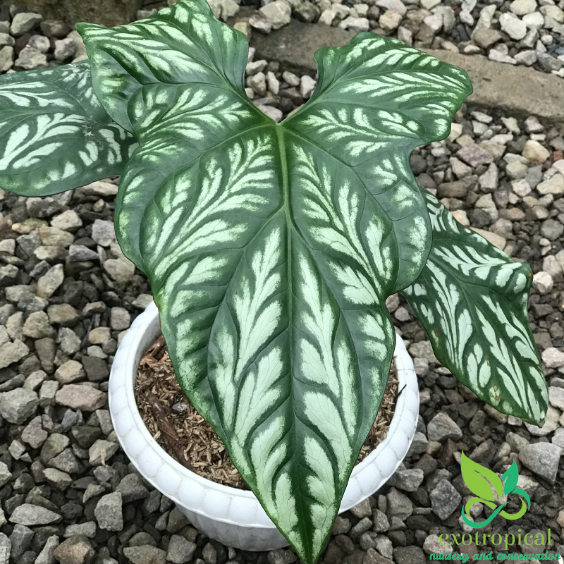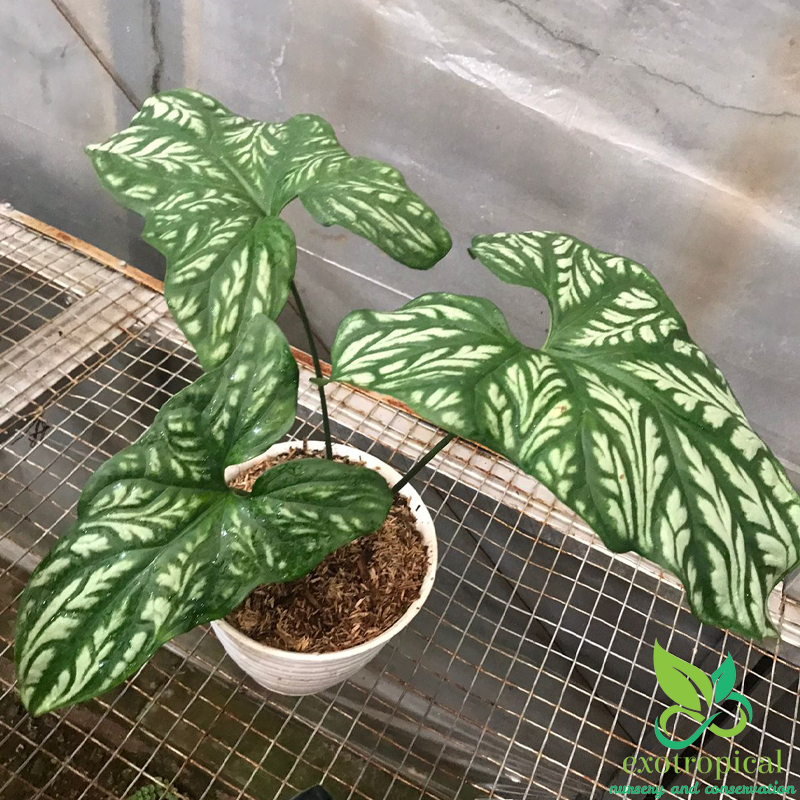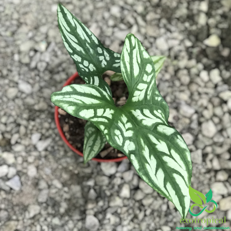 First Found in the tropical west African rain forests of Gabon, Uganda, Cameroon, Equatorial Guinea, Zaire, Benin, Nigeria, and Angola. The leaves have the shape that looks like an arrow head and white embossed markings with patterns like tattoos.