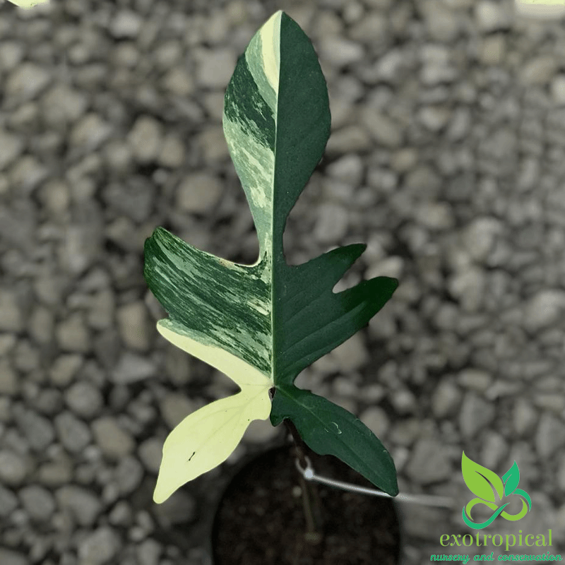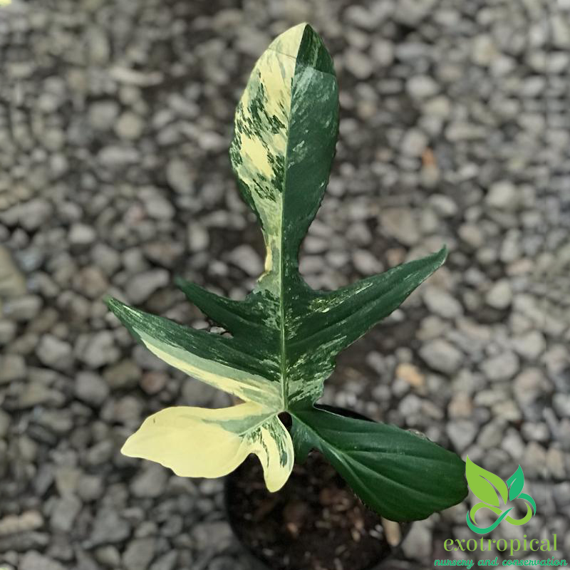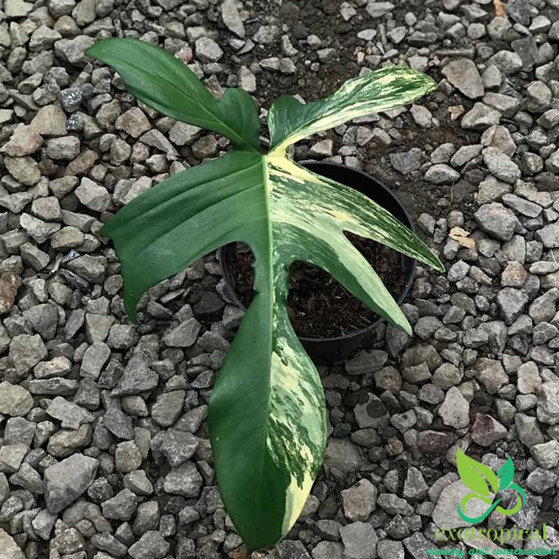 This plant is a hybrid plant between Philodendron Squamiferum and Philodendron pedatum. It has a multi-lobed leaf with a single large lower lobe.