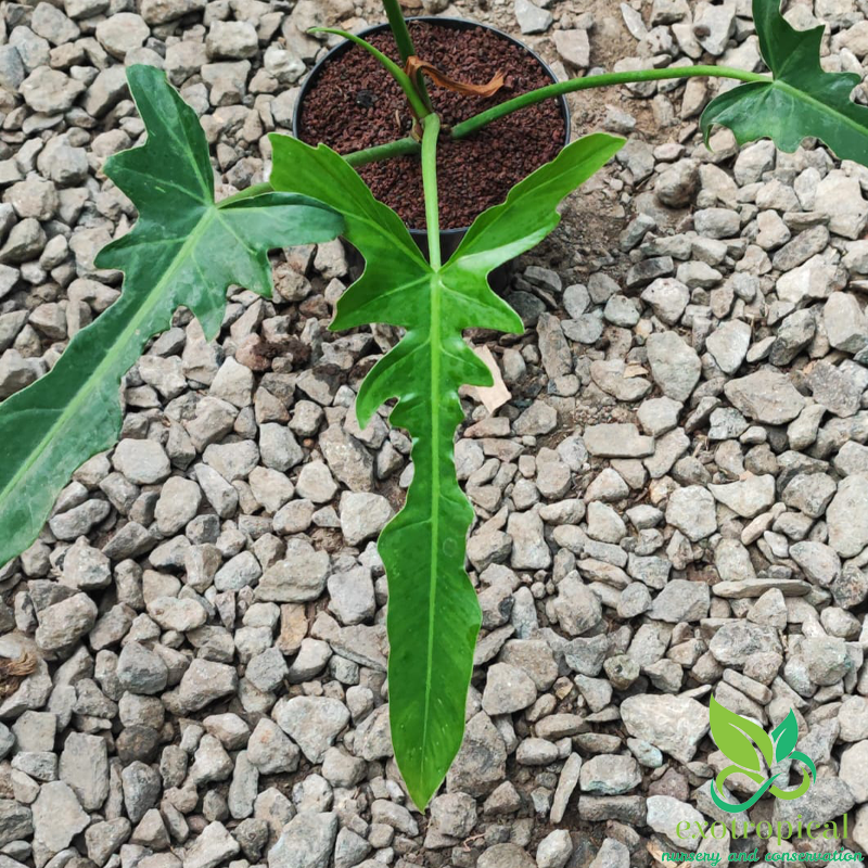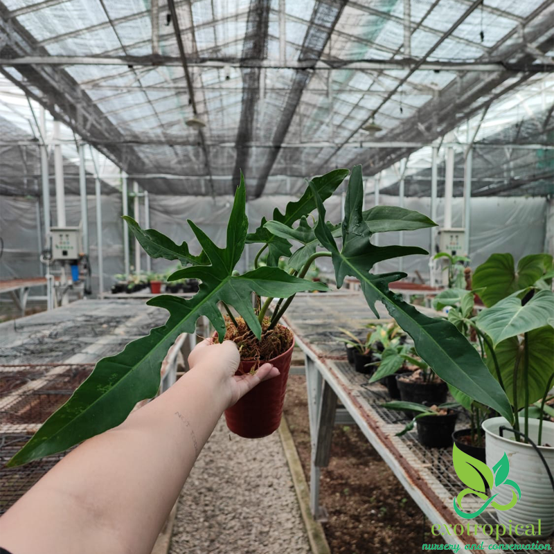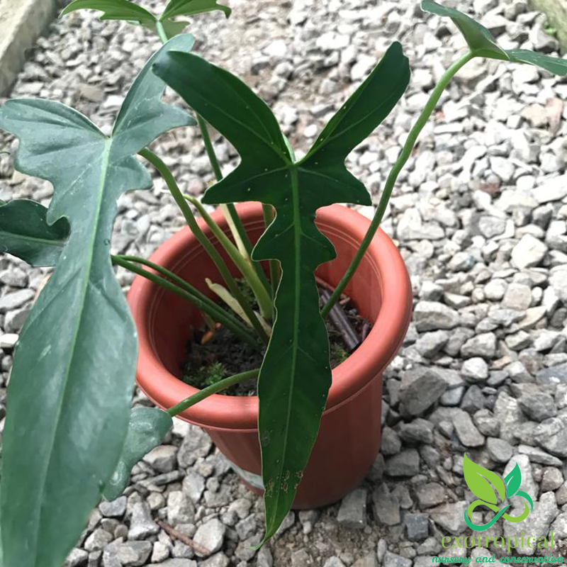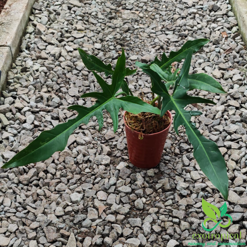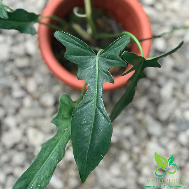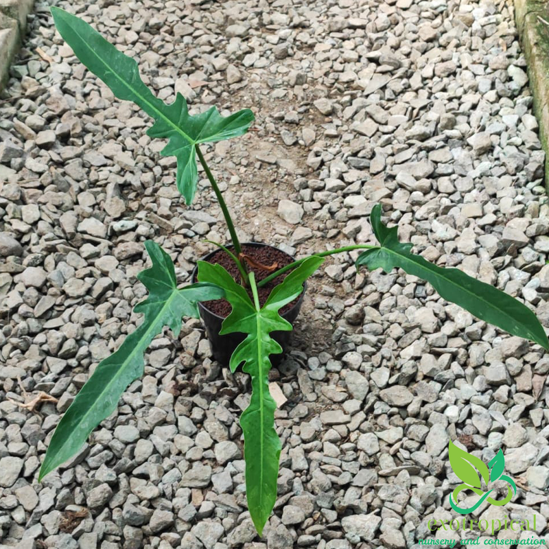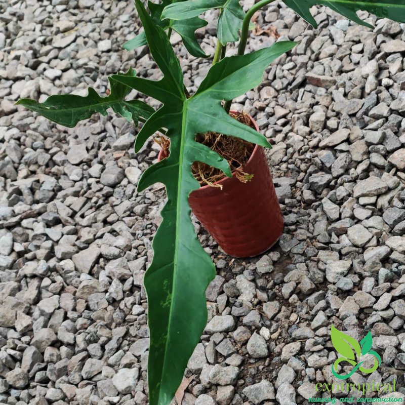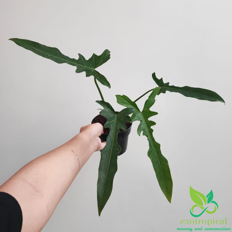 The Philodendron Longilobatum Narrow Dragonfly is native to tropical and subtropical forests. The shape of the leaves is elongated with a pointed leaf tip and jagged at the edge of the leaf and are dark green.