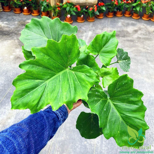 Philodendron Shangri La or as known as Philodendron Bipinnatifidum. This plant has sturdy stems where their large green leaves grow on. They have pointed edges on the foliage and some have lime-green veins that add further texture to them.