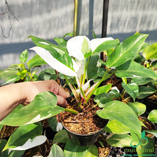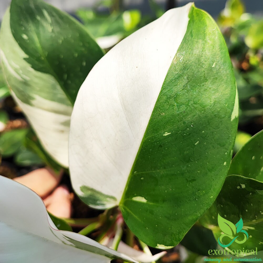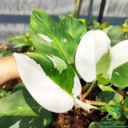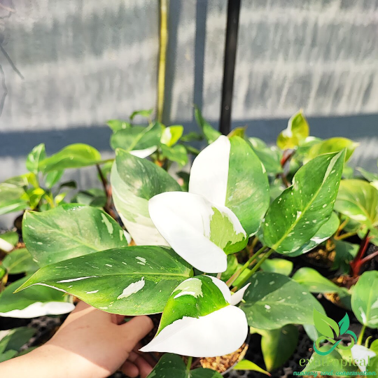 Philodendron White Princess is native to South America which has green pointy leaves and plenty of white variegated speckles and blotches. The white variegation is much lighter than Philodendron White Knight and it has green and slight pinkish color stems too.