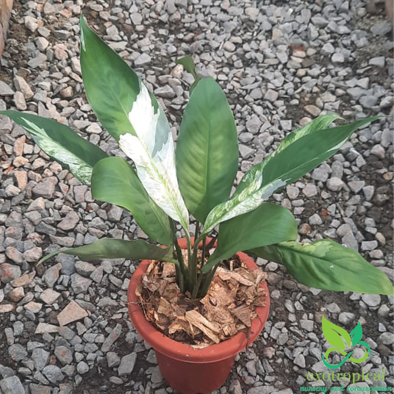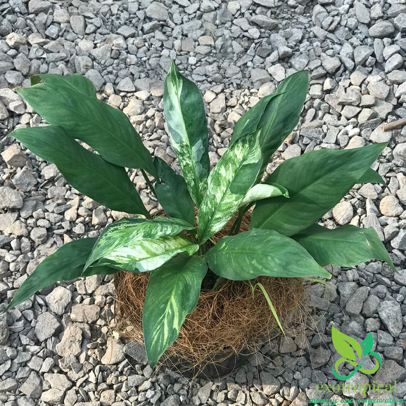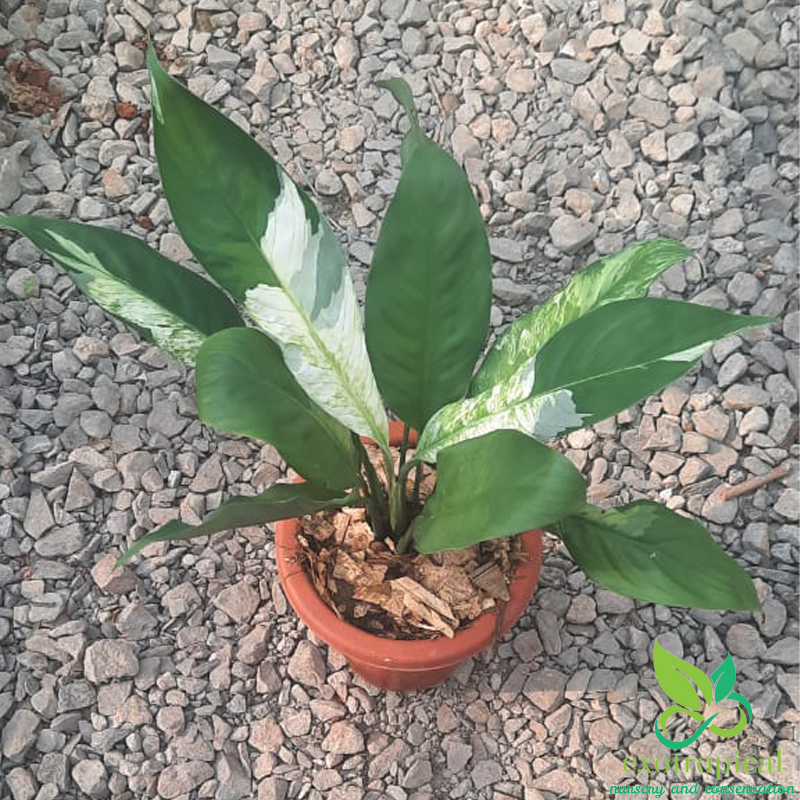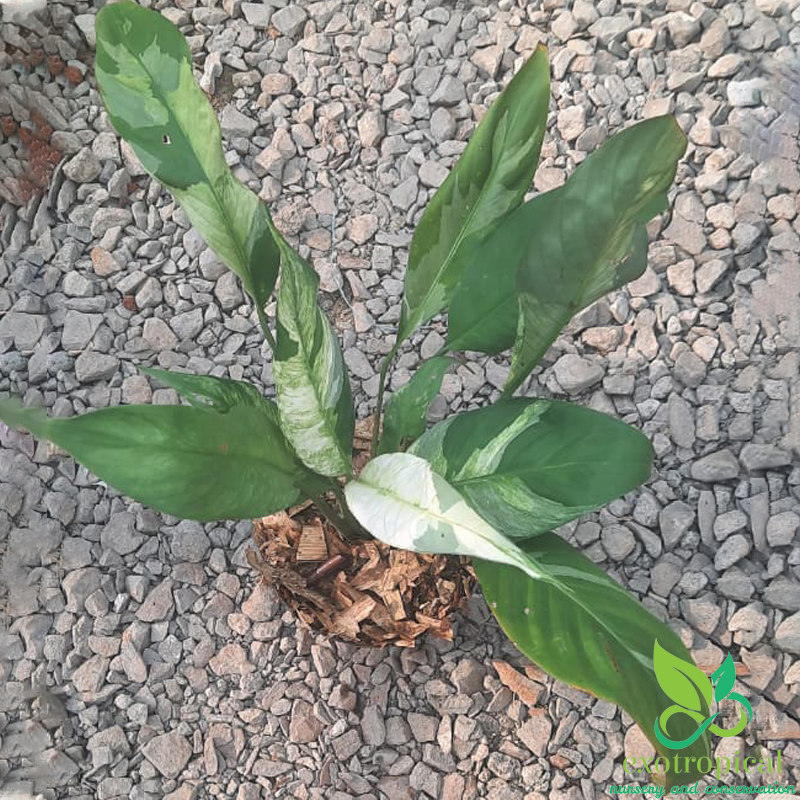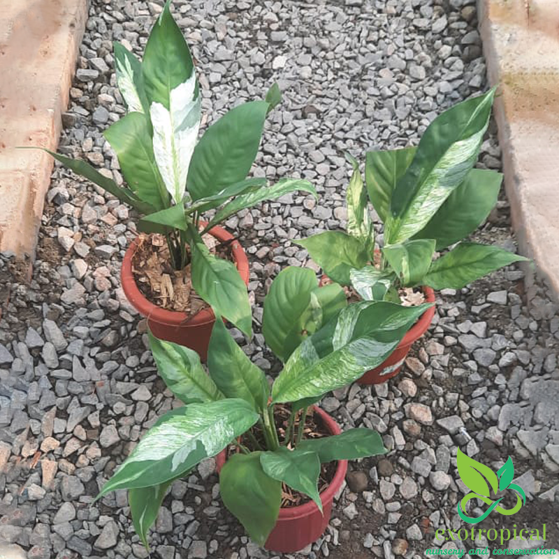 Spathiphyllum Variegated Peace Lily is native to tropical regions of the Americas and southeastern Asia. Their leaves are blotches with white all over each leaf with green based and glossy texture.